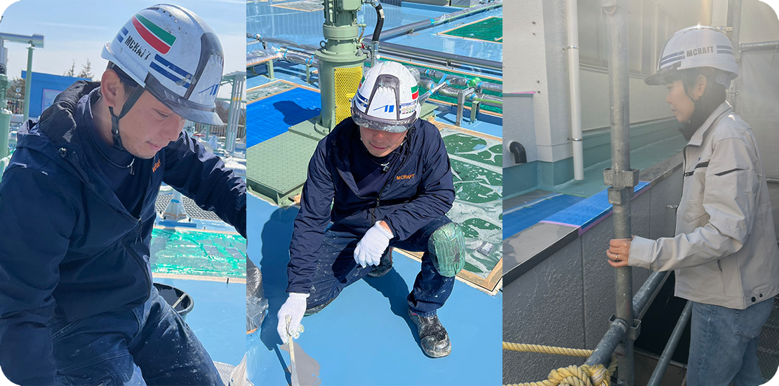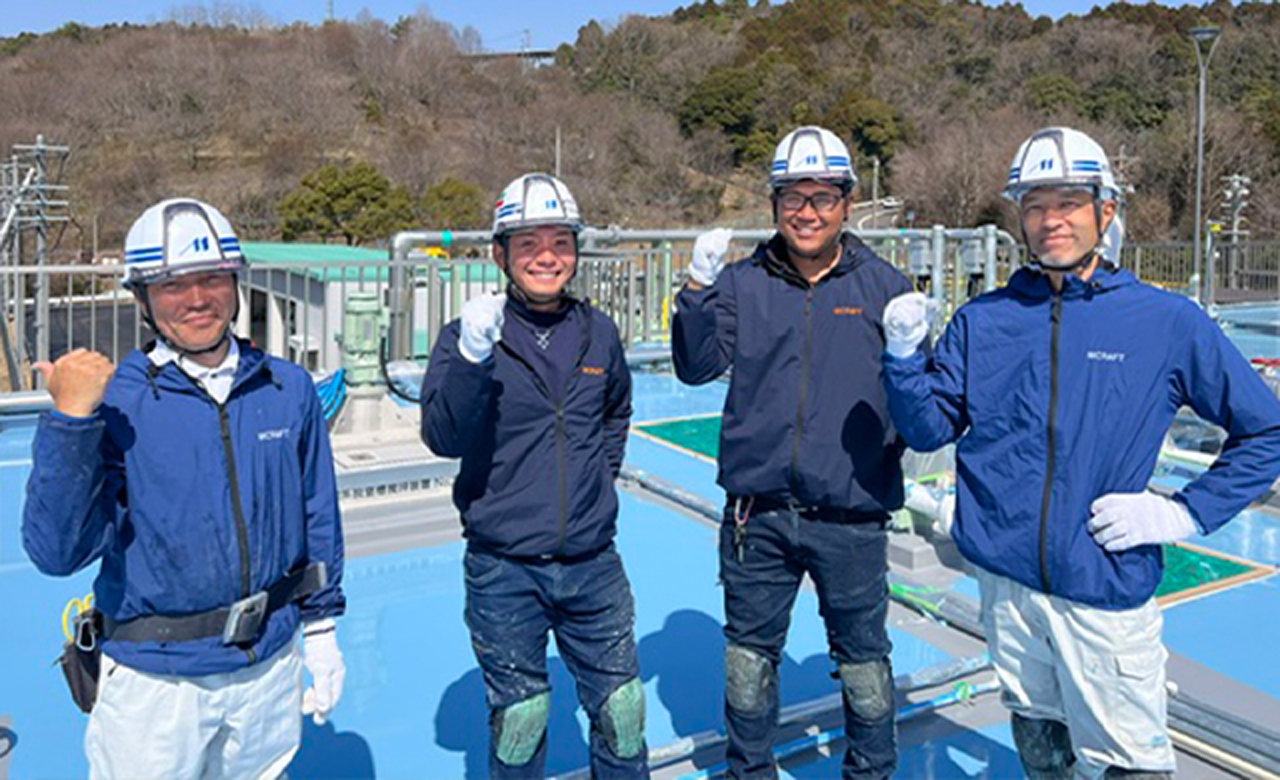 エムクラフトは、防水工事・塗装工事を中心に公共工事を数多く手がける施工会社です。誠実な対応と丁寧な施工を信条に、リピートやご紹介のご依頼を多数いただいております。現場での整理整頓・ご挨拶・安全管理はもちろん、アフターサービスまで徹底。信頼される仕事を積み重ねています。